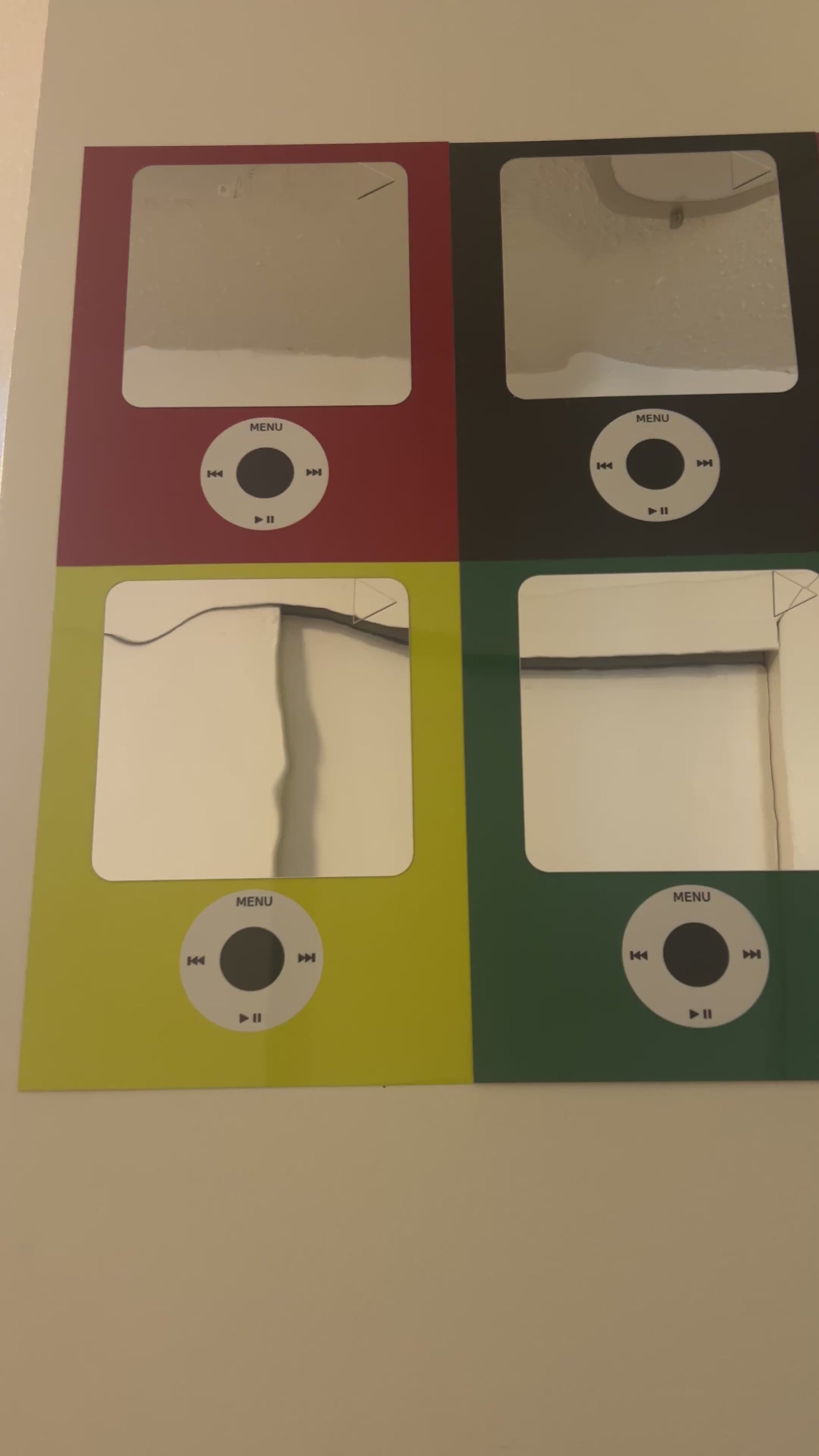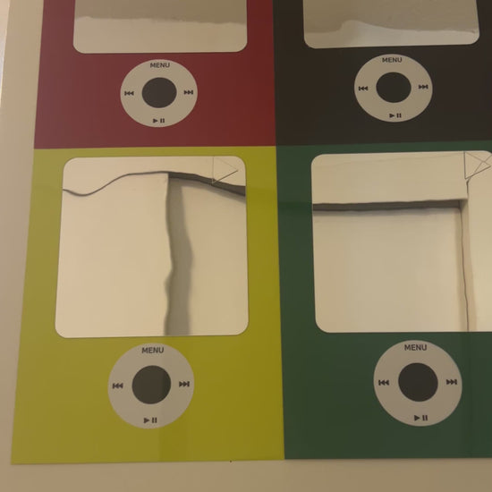 Say hello to the iPod Nano inspired 6 piece wall set, featuring vibrant colors (Red, Black, Blue, Yellow, Pink and Green) crafted of metal and mirror, Bring the nostalgia on with these eye popping iPod mirror set.